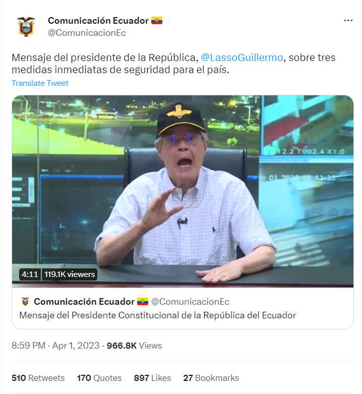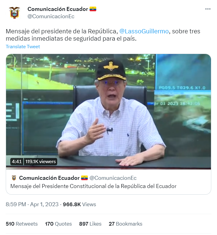 In a nation-wide address on April 1, 2023, Lasso said: “We have three common enemies: delinquency, narcotrafficking and organised crime. We will combat these with three urgent measures.” Notably, he introduced a decree that lifted a 12-year ban on civilians owning firearms. According to Lasso, these security measures will bring “peace and tranquillity” for Ecuadorian people.